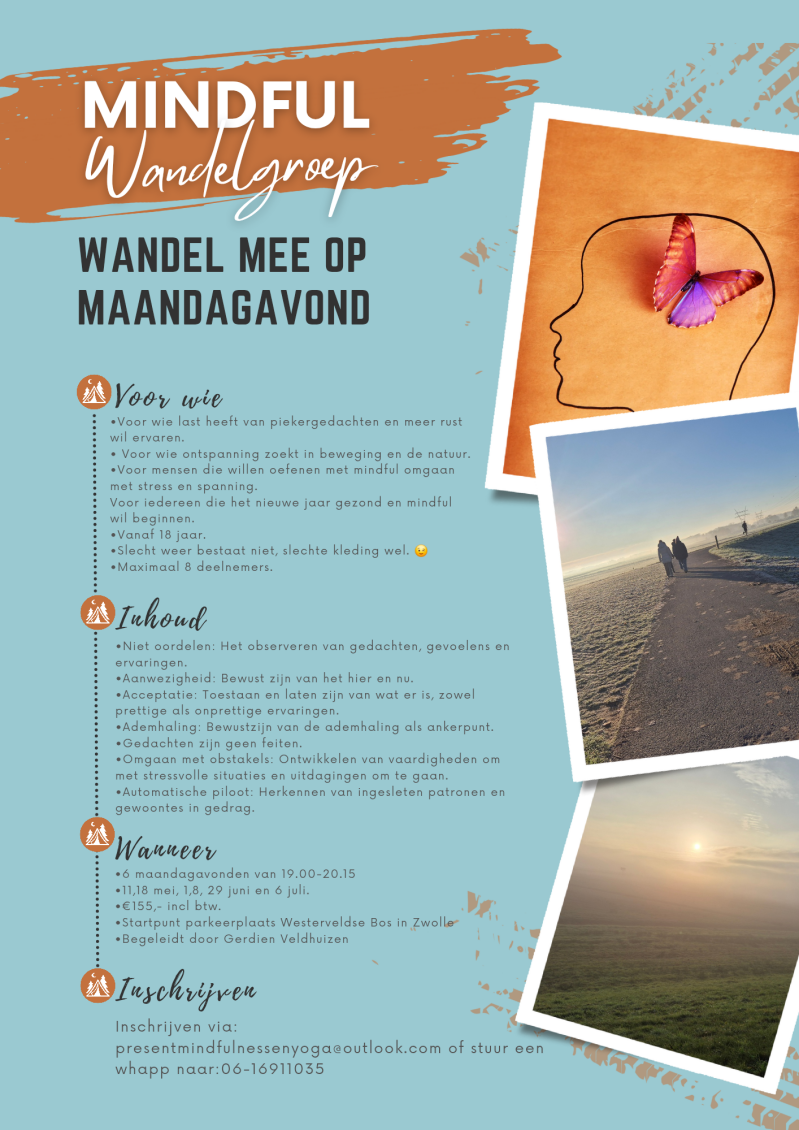 De mindfulness training bestaat uit 6 wandelsessies. Aan de hand van diverse oefeningen, onderzoek je hoe je mindfulness onderdeel van je dagelijks leven kan maken. Door mindfulness beoefening, leer je met je aandacht in het hier en nu te zijn.